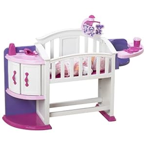 Nursery has everything you need including crib, storage shelf and cupboard, feeding chair and even sink. Includes mobile with colorful character decals, fork, spoon, plate,sippy cup and play baby powder dispenser. Measures 36 3/8 inches 10 5/8 inches 26 1/8 inches .